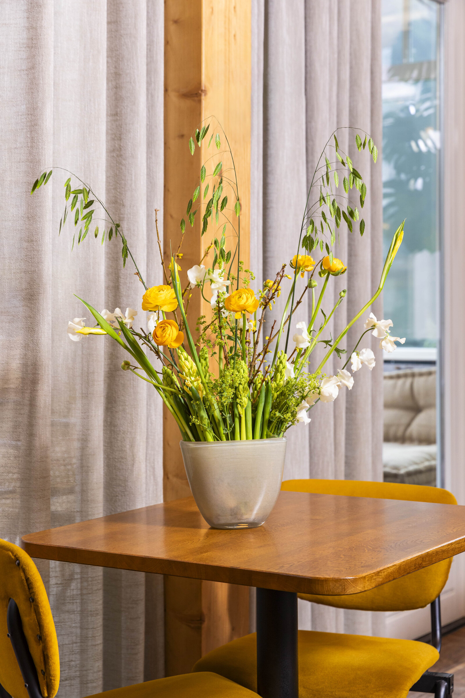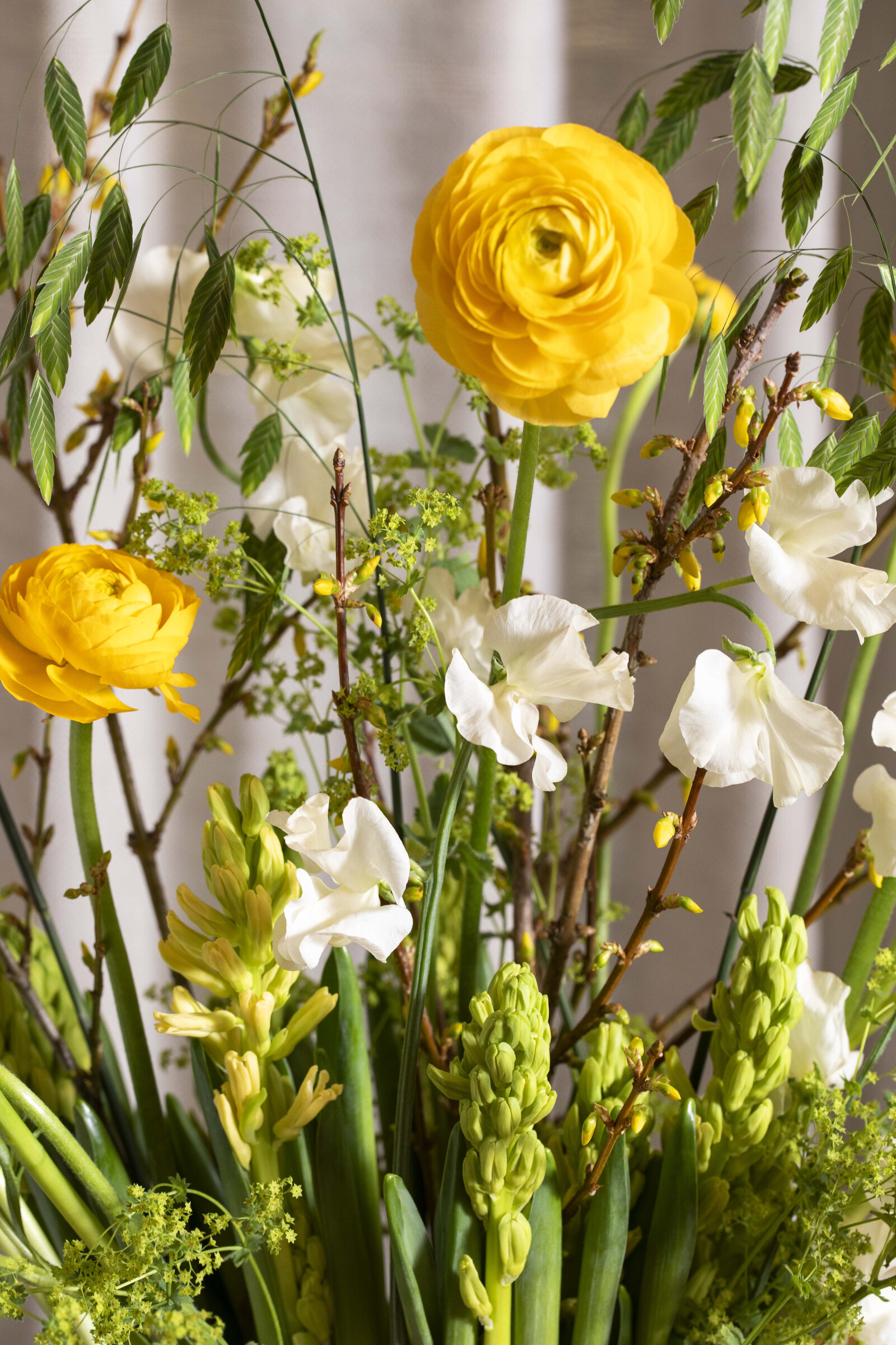 Ranunculus ma charyzmę. Ma smukłą, świeżo-zieloną łodygę, a kwiaty są kolorowe i wyrafinowane, z wieloma delikatnymi płatkami, które łączą się, tworząc bujne i pełne kwiaty.